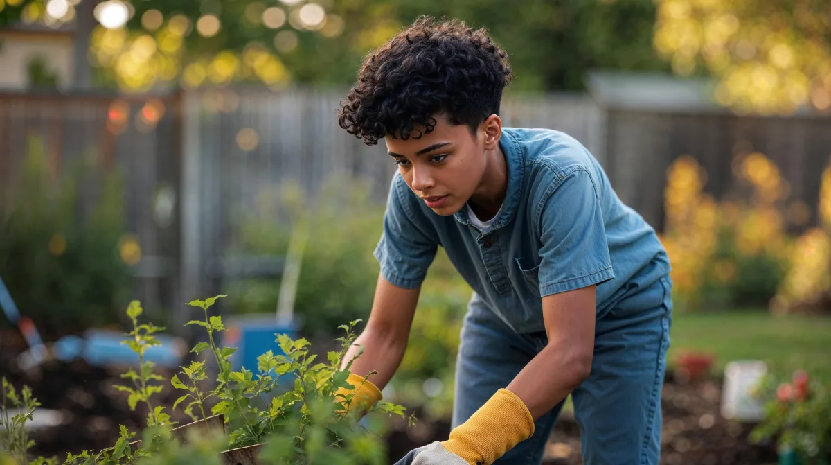 Working on a gardening project, school garden, raised bed, mini farm, backyard growing project.